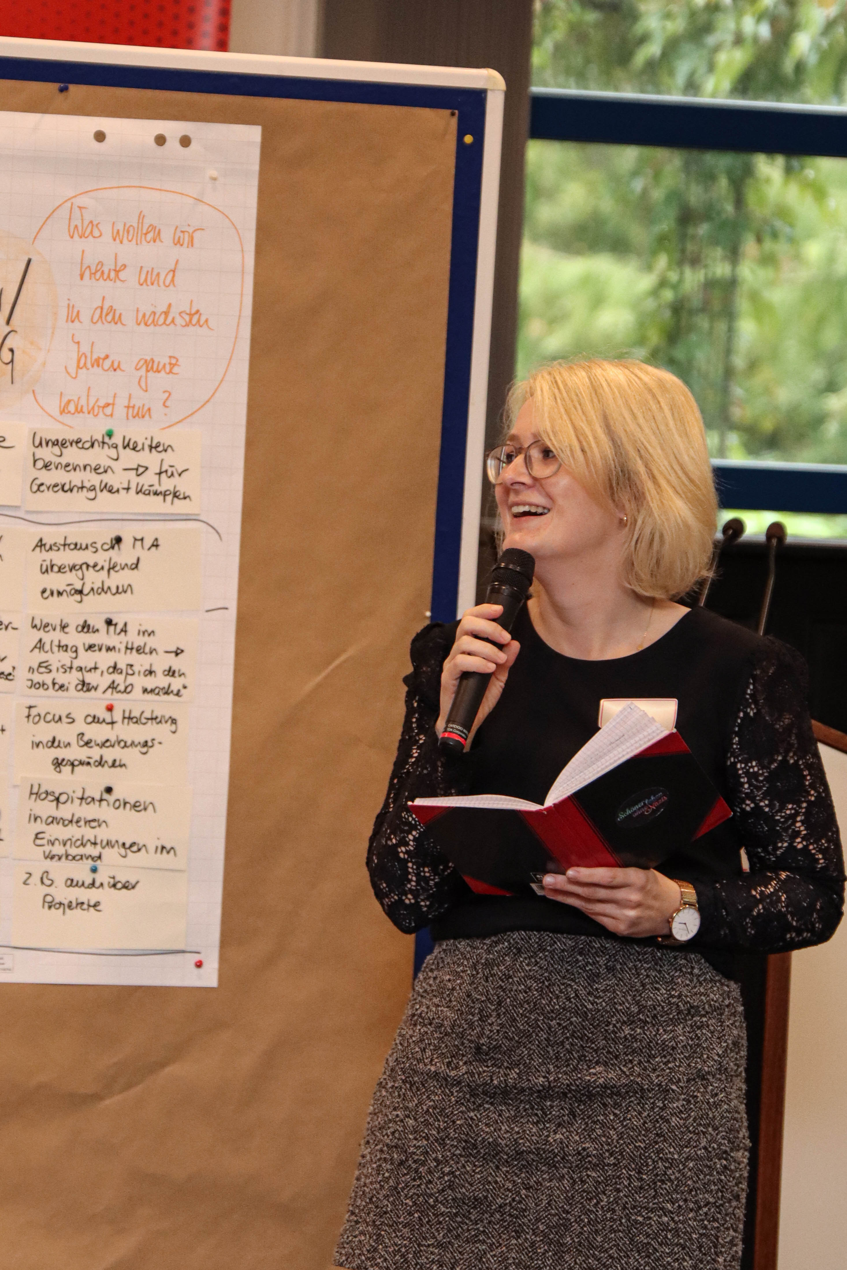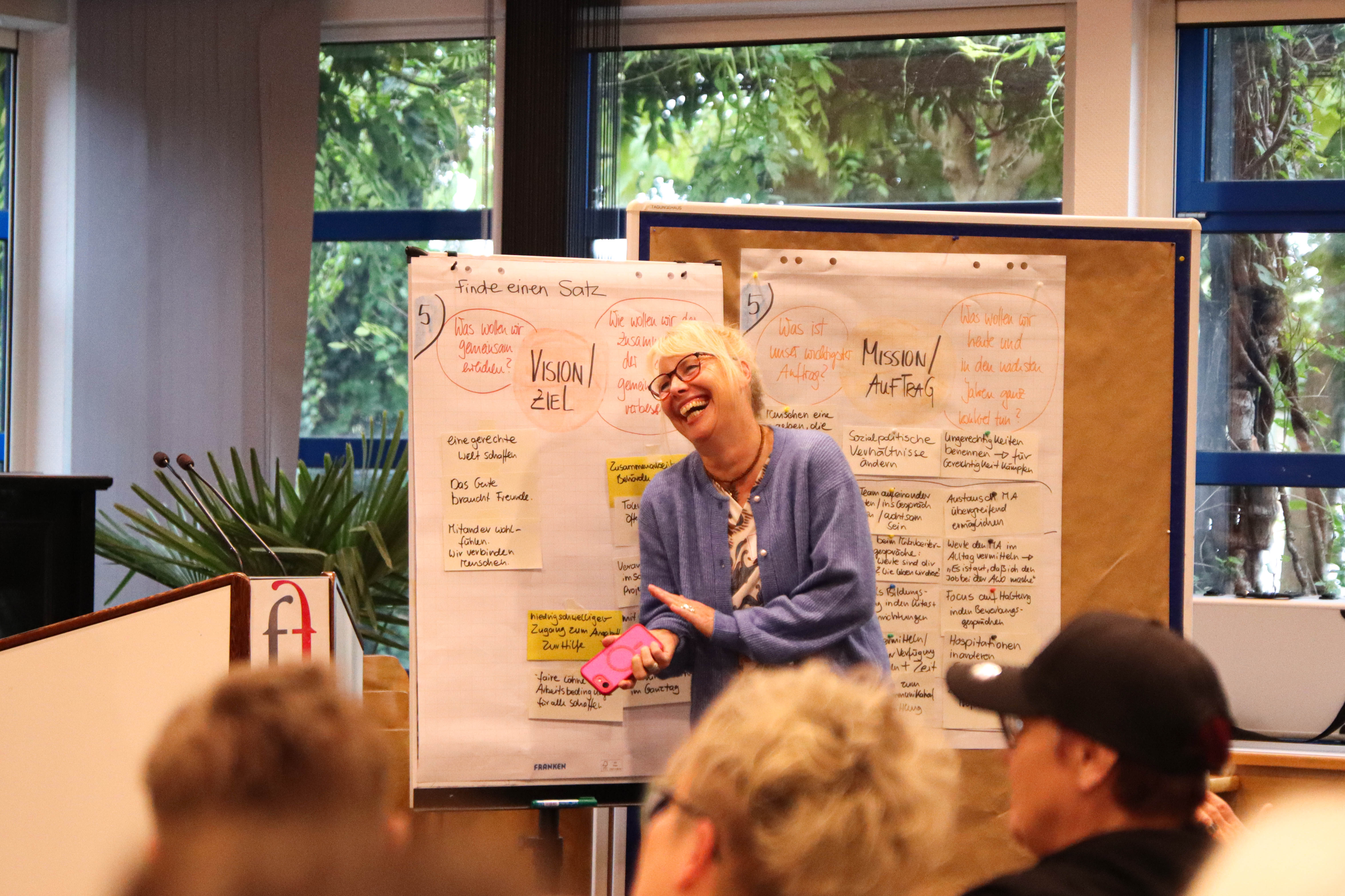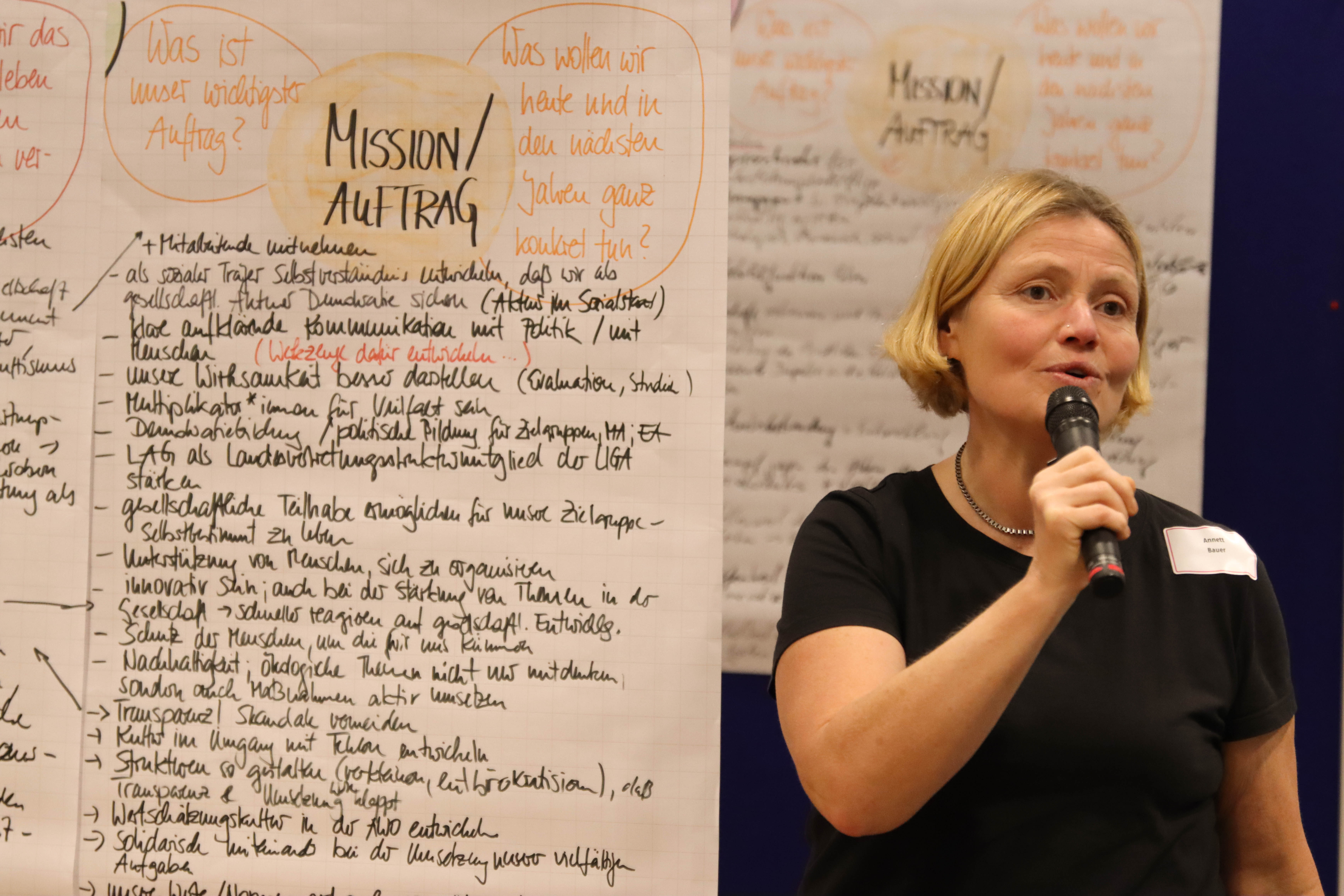 Der Workshop ist einer von mehreren Zwischenstopps, um die AWO Grundwerte inhaltlich neu zu definieren. Die vor mehr als 100 Jahren von AWO-Gründerin Marie Juchacz formulierten Grundwerte Solidarität, Toleranz, Gleichheit, Freiheit und Gerechtigkeit bilden bis heute die Grundlage für die Arbeit der Arbeiterwohlfahrt, einem der Spitzenverbände der Freien Wohlfahrtspflege. Ziel sei es, dem Verband einen Plan zu geben, „um das eigene Selbstverständnis zu stärken. Wir alle sind die AWO und gestalten gemeinsam unsere Zielrichtung“, sagte Vorstandsreferentin Jane Baneth, die gemeinsam mit anderen Kolleg*innen die „große Fahrt“ koordiniert. Und so war es dann auch.