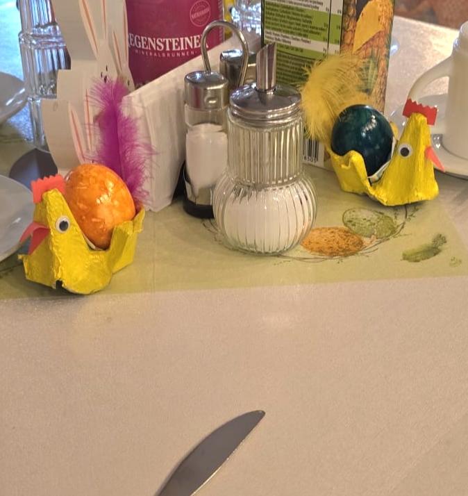 Auf dem Frühstückstisch im Restaurant und den Wohnbereichen standen bereits die von unserem fleißig helfenden Küchenhuhn, Iris B., liebevoll selbst gebastelten Osternester. Ohne ihre Hilfe würde der Hase es gar nicht schaffen... Text: Stephie H. und Jana S., Ergotherapeutin und Sozialdienst Fotos: Samanta Schürrer, Pflegekraft und Julia M., Betreuung, Iris B., stellv. Küchenleiterin