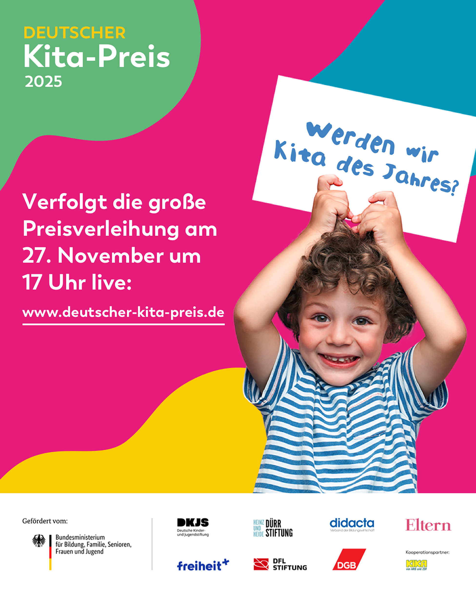 Datum: 27. November 2025 Uhrzeit: Ab 17 Uhr Livestream:www.deutscher-kita-preis.de Seid dabei und fiebert mit uns! Bis bald im Livestream!