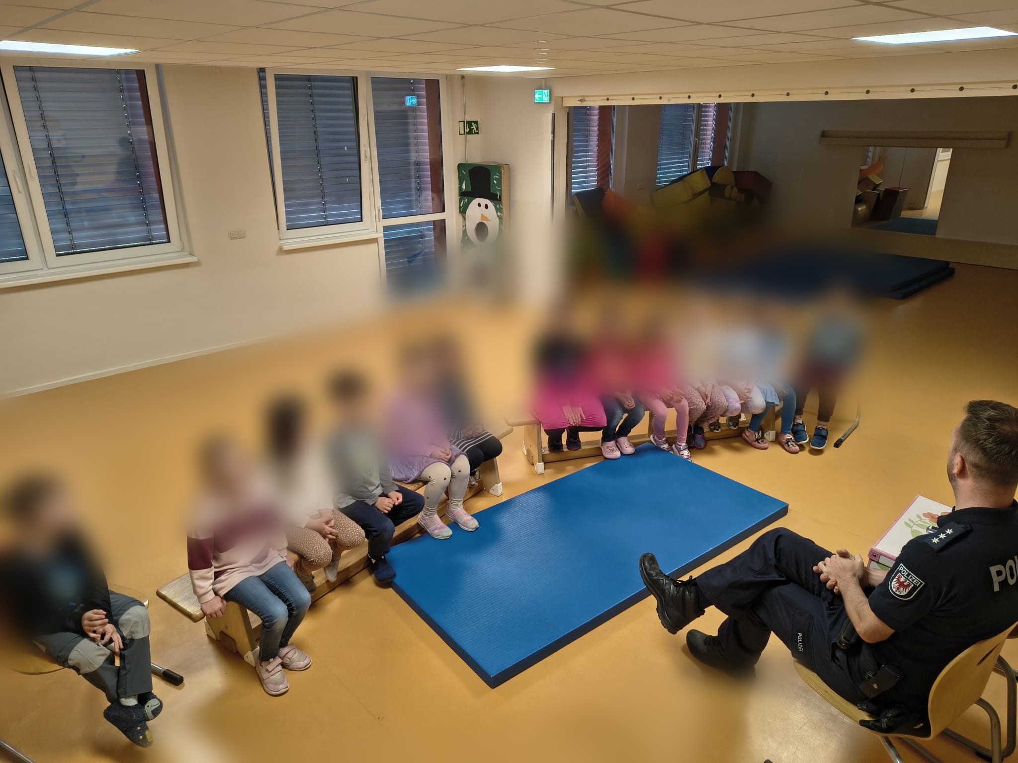 Am 17.04.2026 war die Polizei zu Besuch bei unseren Vorschulkindern. Zur Vorbereitung auf den Übergang in die Schule lernten alle spielerisch, wie man sich richtig auf dem Schulweg verhält. Und das hat richtig Spaß gemacht mit einem echten, netten Polizisten.