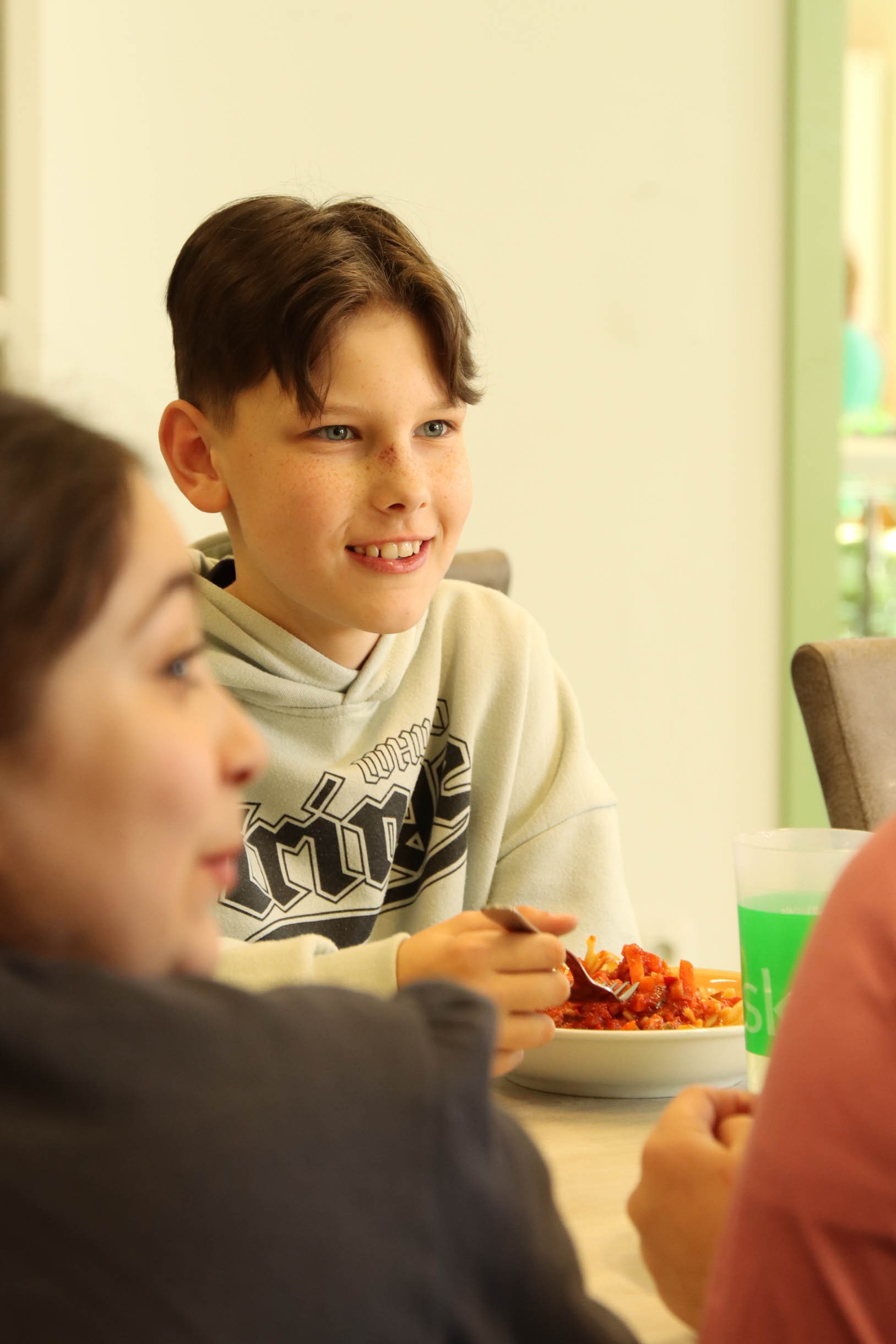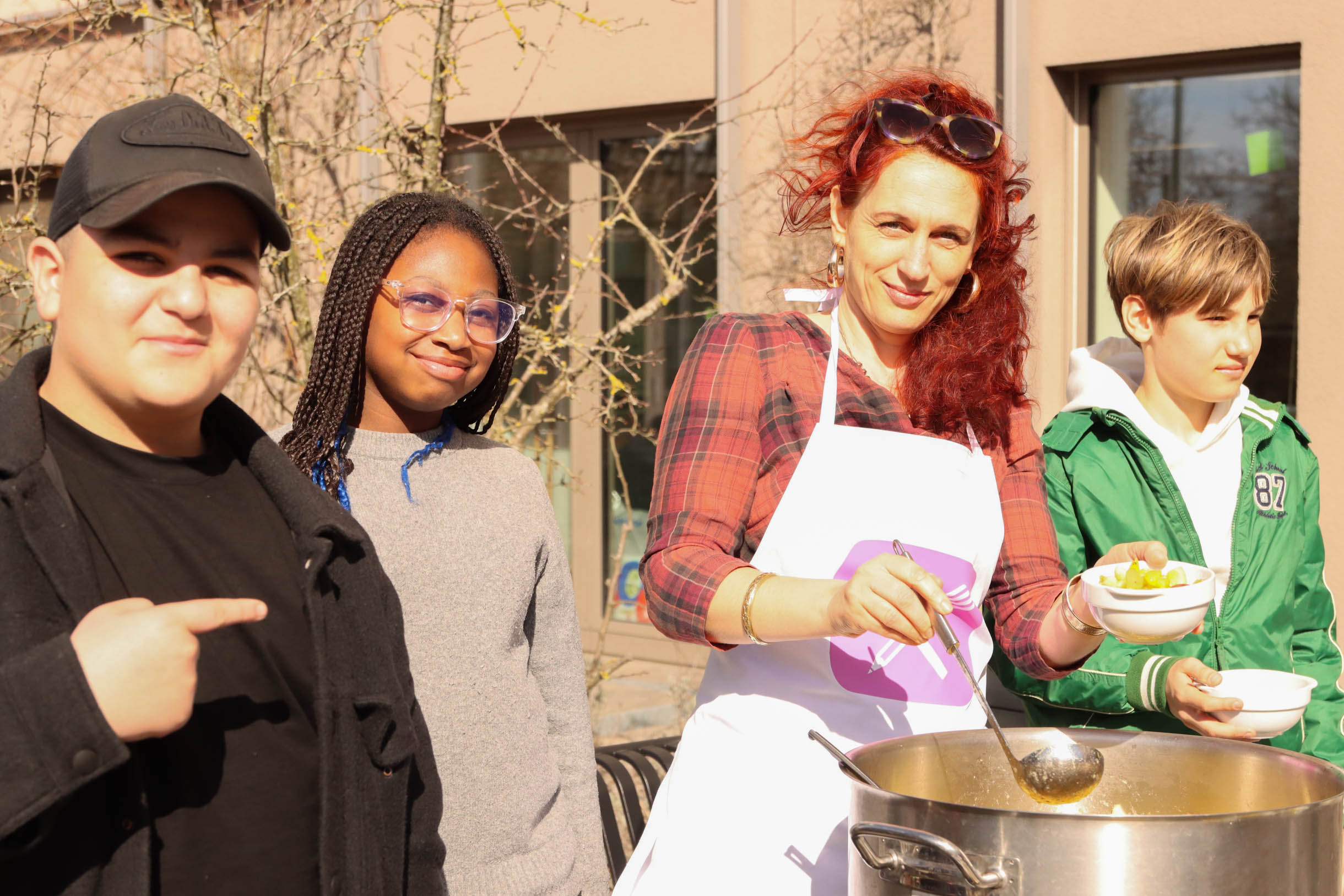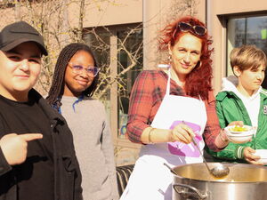 Manche Schüler*innen hatten offenbar richtig Hunger im Begegnungszentrum Oskar in Potsdam-Drewitz. Bis zu drei Mal rannten die Kinder der benachbarten Grundschule am Priesterweg nach draußen zur großen roten Feldküche und holten sich einen Nachschlag. Es gab frischen Obstsalat, gesunde Getränke und jede Menge Vollkornnudeln in Gemüse-Tomatensoße. Mit einem gemeinsamen gebührenfreien Mittagessen startete am heutigen Freitag die Volksinitiative „Einführung eines gebührenfreien und gesunden Mittagessens für Schülerinnen und Schüler der Klassen 1 bis 6 im Land Brandenburg“ für mehr Chancengleichheit in der Bildung. Die Netzwerkpartner hatten die Klassen 5 und 6 unter dem Motto „Gerechtigkeit is(s)t besser“ zu einem Mittagessen in das Begegnungszentrum Oskar eingeladen. Wer schon fertig war mit dem gemeinsamen Essen, konnte sich bei den Spielangeboten des AWO Büro KINDER(ar)MUT die Zeit zu vertreiben. Besonders beliebt war das Glücksrad, an dem kleine Preise gewonnen werden konnten – allerdings in Verbindung mit einer kleinen sportlichen Übung.