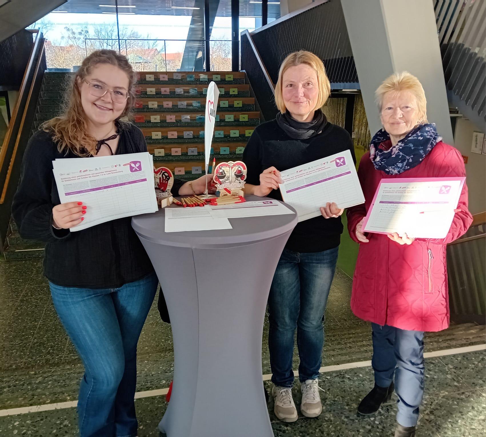 Bereits ab dem frühen Morgen hatten sich erste Eltern in die vorbereiteten Unterschriftenlisten eingetragen, um damit die Initiative zu unterstützen. Insgesamt kamen dabei rund Unterschriften zusammen. Die Volksinitiative hat jetzt ein Jahr lang Zeit, um landesweit mindestens 20.000 gültige Unterschriften zu sammeln. Gelingt das, muss sich der Landtag damit beschäftigen. Anwaltlich begleitet wird sie durch Dr. Gregor Gysi. „Wir fordern seit langem ein gebührenfreies Schulessen für alle Kinder,“ sagte Jane Baneth, Vorständin des AWO Bezirksverband Potsdam e.V. „Chancengleichheit in der Bildung darf nicht am Mittagstisch enden. Gerade mit dem Ausbau des Ganztags in Brandenburg wird ein gesundes und gebührenfreies Schulmittagessen für alle Kinder immer wichtiger. Es ist ein wirksames Mittel gegen Kinderarmut und stärkt gleichzeitig das soziale Miteinander im Schulalltag“, sagte sie.