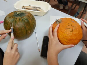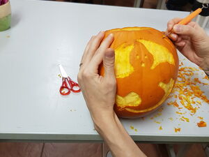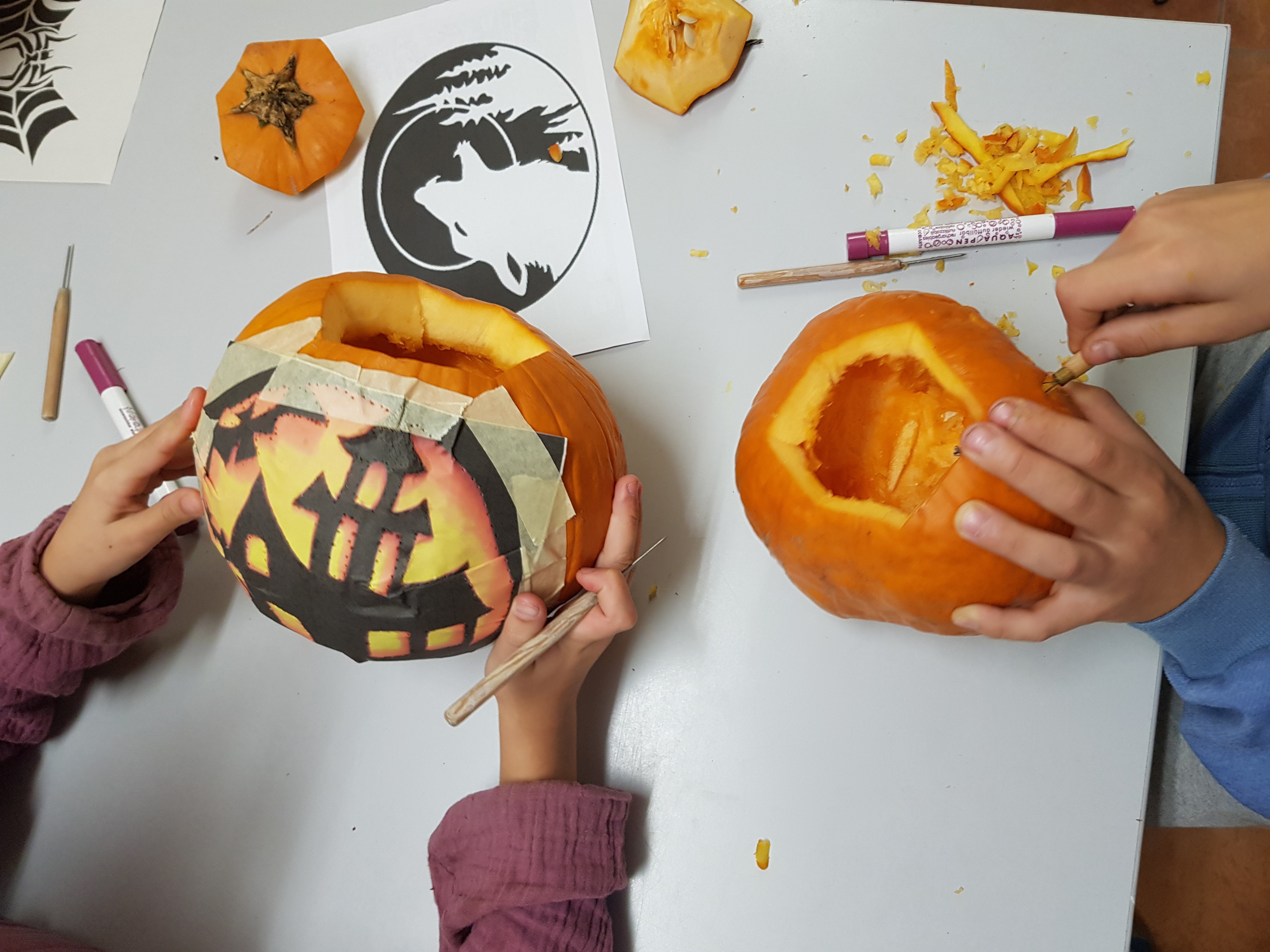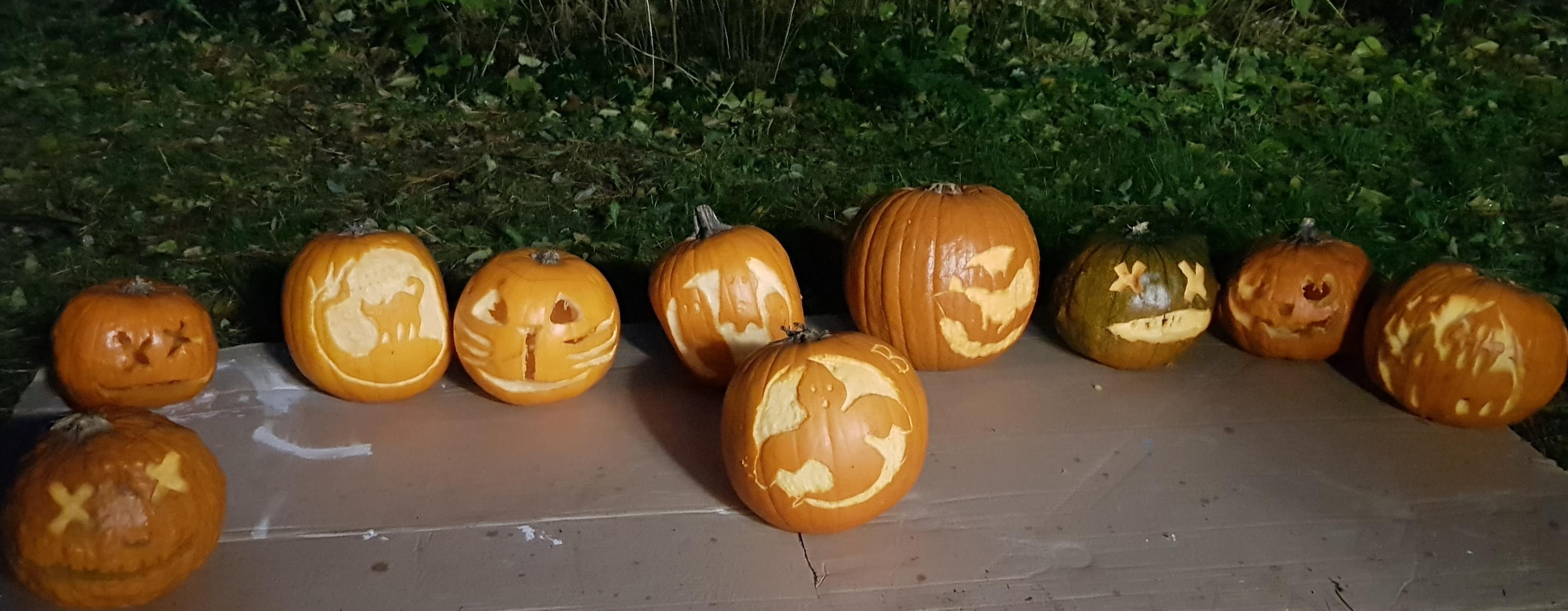 Auch 2025 war unser „Lange Treff“ in den Herbstferien mehr als gut besucht: 18 Kinder und Jugendliche nutzen die Zeit um zunächst mittels Stift oder Nadel verschiedenste Motive auf die Kürbisse zu bringen und anschließend in das Obst zu schnitzen oder zu schaben. Die Zeit verging wie im (Hexen-)flug und am Ende standen, bzw. lagen die Gruselgesichter versammelt in unserem Garten neben Geistern, Hexen und Knochen für das obligatorische Gruppenphoto.