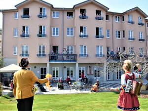 Die Klinikclowns vom Verein Lachen hilft e.V. gaben heute in Werder/Havel ein Konzert. Und das, wo doch wegen der verordneten Kontaktsperre eigentlich alle Veranstaltungen abgesagt sind. Die Spaßmacher, die normalerweise viel mit Berührungen arbeiten, hielten Abstand. Sie stellten sich auf den Hof der AWO Seniorenzentren "Schwalbenberg" und "Wachtelwinkel" und musizierten vor der Häuserkulisse. Pfleger*innen und Bewohner*innen winkten von ihren Balkonen zu den Clowns herunter. Für die meisten Senioren sind "Vitamine" und "Tute Caruso" ihrer regelmäßigen Besuche wegen schon alte Bekannte. Herzliche Begrüßungen mussten heute ausbleiben, gemeinsames Lachen aber war Umarmung genug.