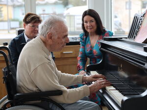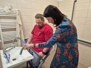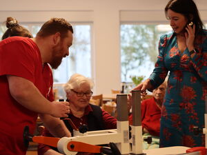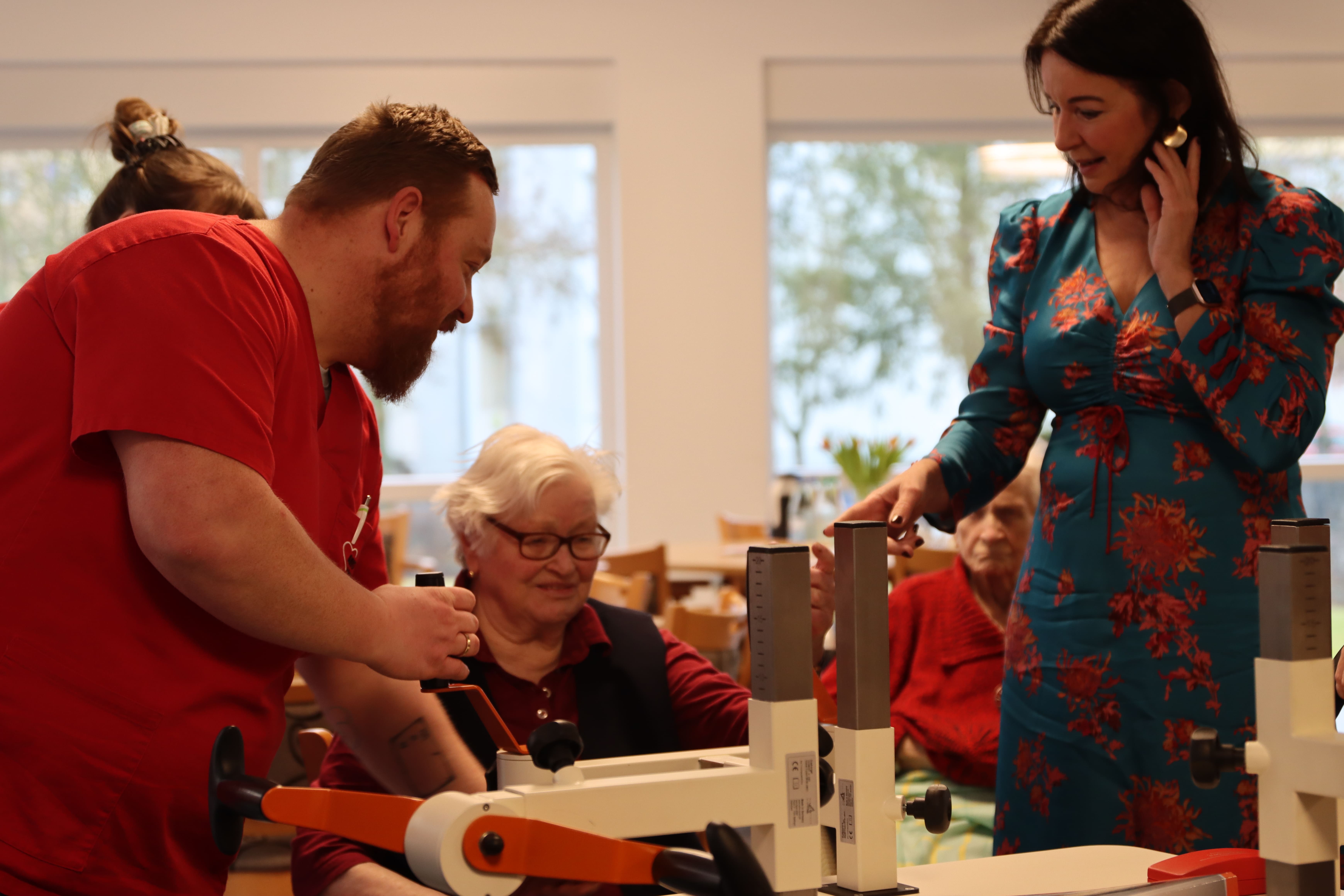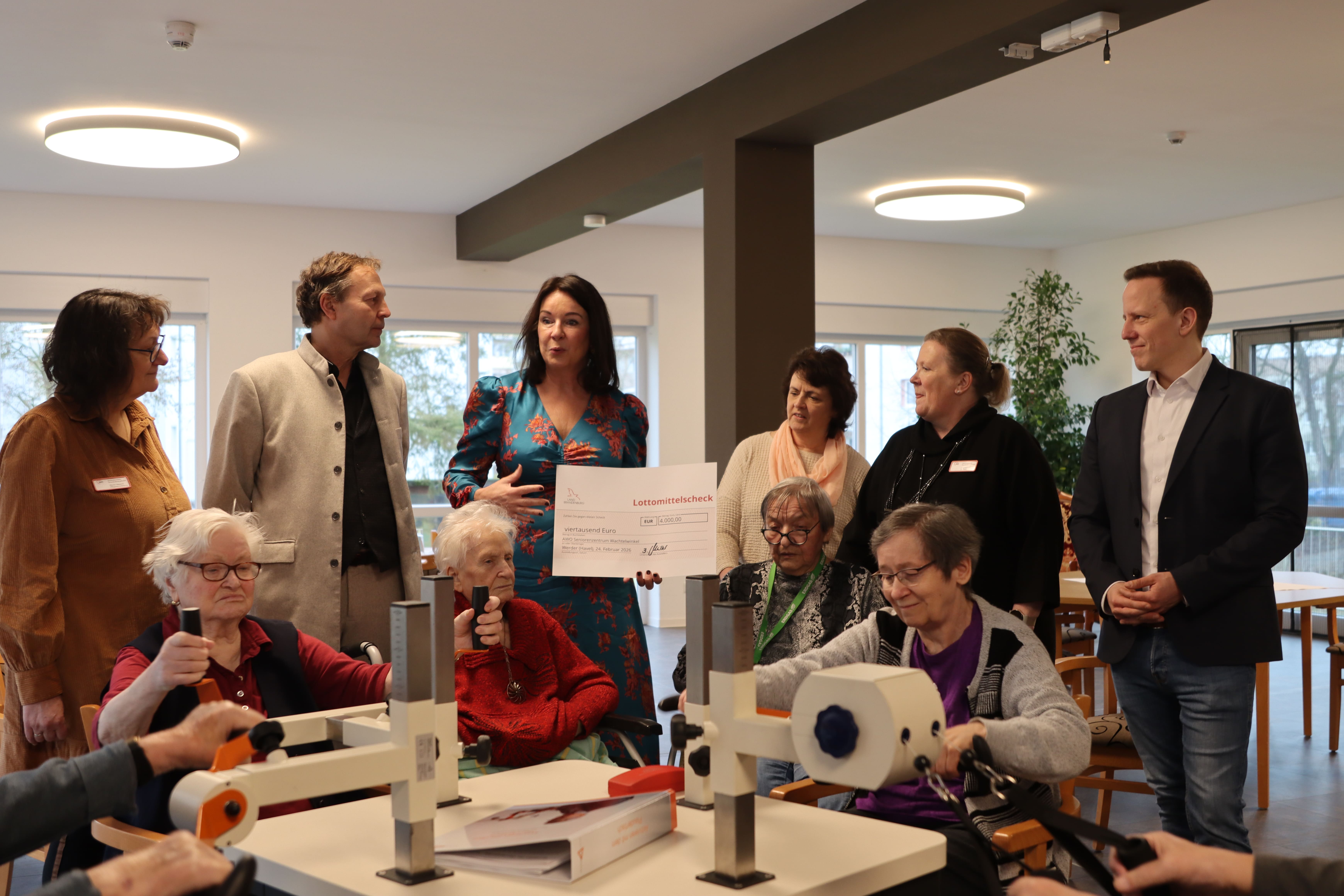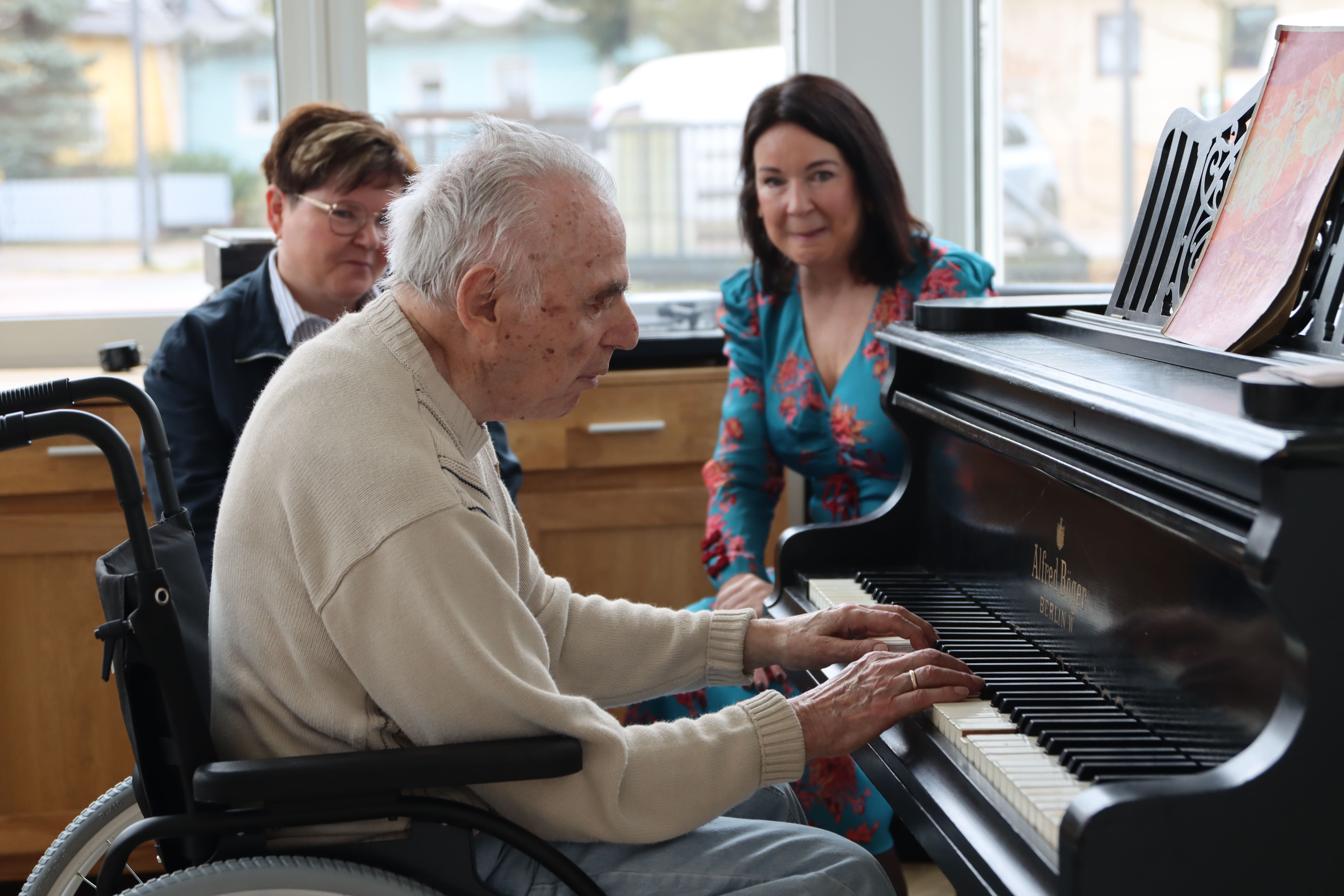 Dann ging es aber von der Cafeteria in Begleitung von Stefan Zaborowski, Geschäftsführer der AWO Seniorenzentren Brandenburg gGmbH und Einrichtungsleiterin Linett Schuldt in den Bereich der stationären Pflege. Aus dem Musikzimmer klangen Volksweisen, am Flügel saß ein Bewohner und spielte, was ihm in den Sinn kam. Ministerin Müller und einige vom Pflegepersonal sangen mit. Im Anschluss stellte Ulli Geßwein, Pflegefachkraft und einer von insgesamt drei Ergo-Coaches im Haus, die modernen Pflegehilfsmittel wie den Aktivlifter oder den Schienen geführten Hebe-Lift vor. „Wir sind das am besten ausgestattete Seniorenzentrum der AWO“, sagte Leiterin Linett Schuldt, „und einzigartig in Brandenburg“. Leider seien aber die Investitionskosten für den 2017 fertig gestellten Neubau mit den hellen und geräumigen Bewohner-Zimmern nur zu Teilen refinanzierbar, da das Landesamt für Soziales und Versorgung (LASV) den Umlageanteil begrenze, beklagte Geschäftsführer Zaborowski. Das nehme die Lust am Bauen, was aber dringend notwendig wäre.