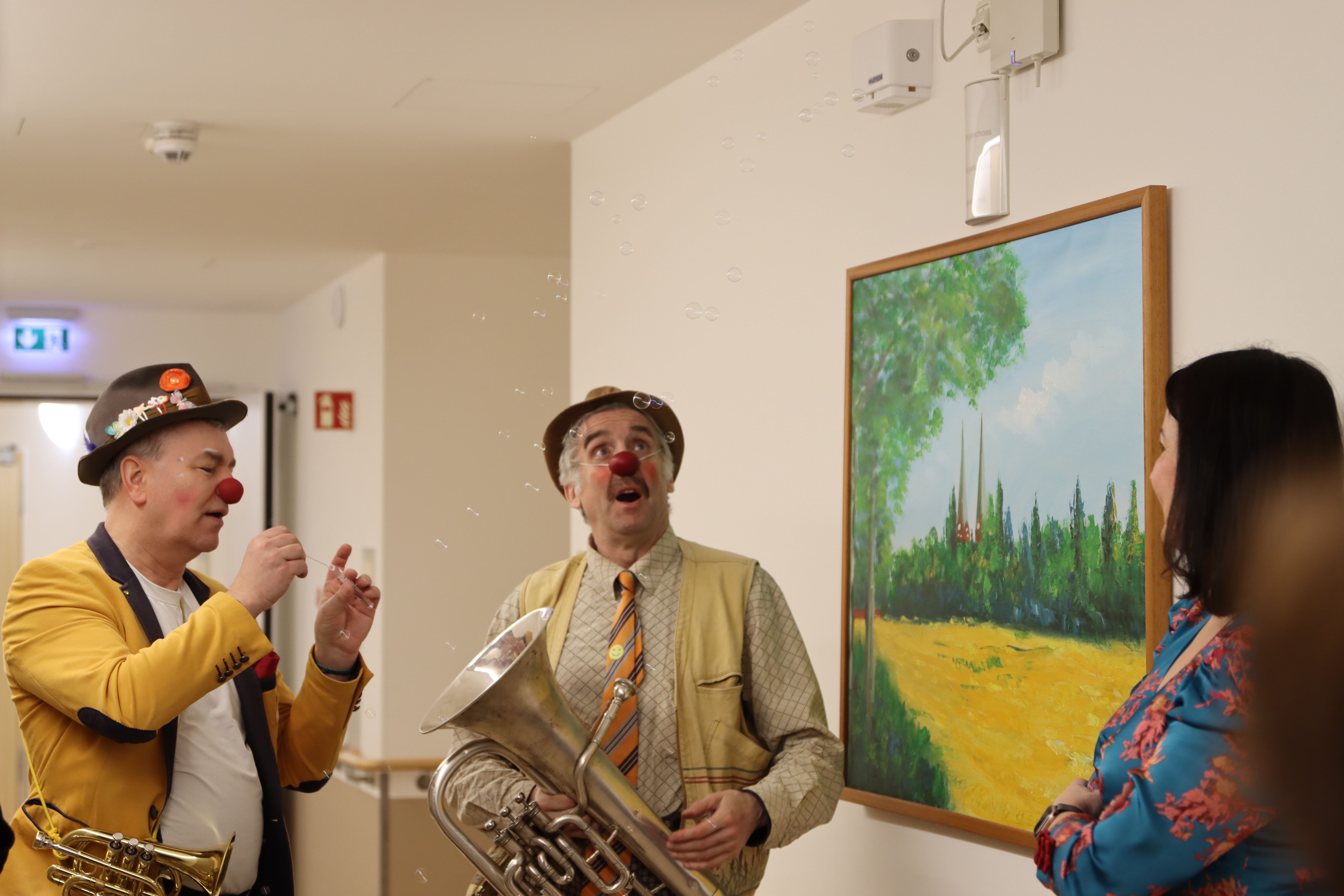 Auf dem Flur traf die Sozialministerin noch „Tute Caruso“ und „Dirk Dingens“, beide Klinikclowns vom Potsdamer Verein Lachen hilft e.V., der schon seit vielen Jahren Clownsbesuche im Wachtelwinkel macht. Von Gagen und Spenden lebe der Verein, warb Linett Schuldt für die Clownerie. Sie habe noch ein bisschen Geld übrig, dass sie gerne dem Verein gebe, erklärte Müller.