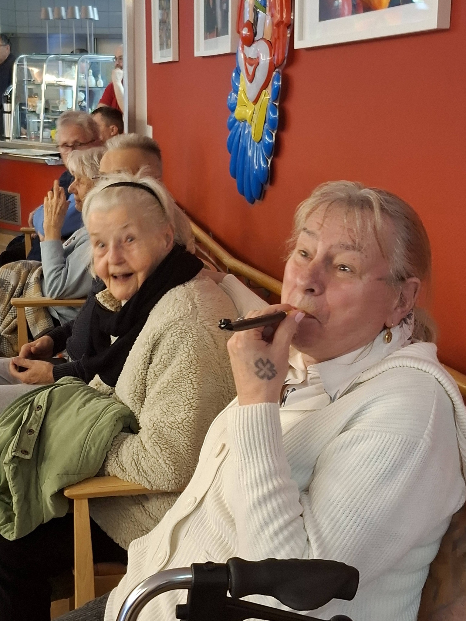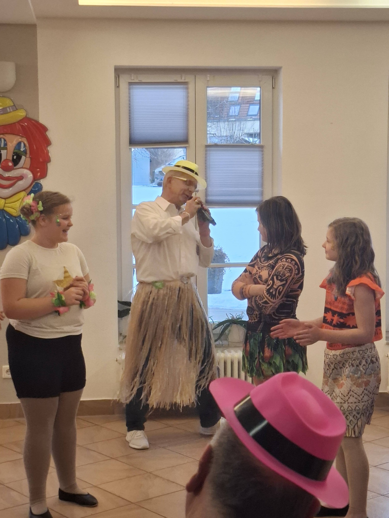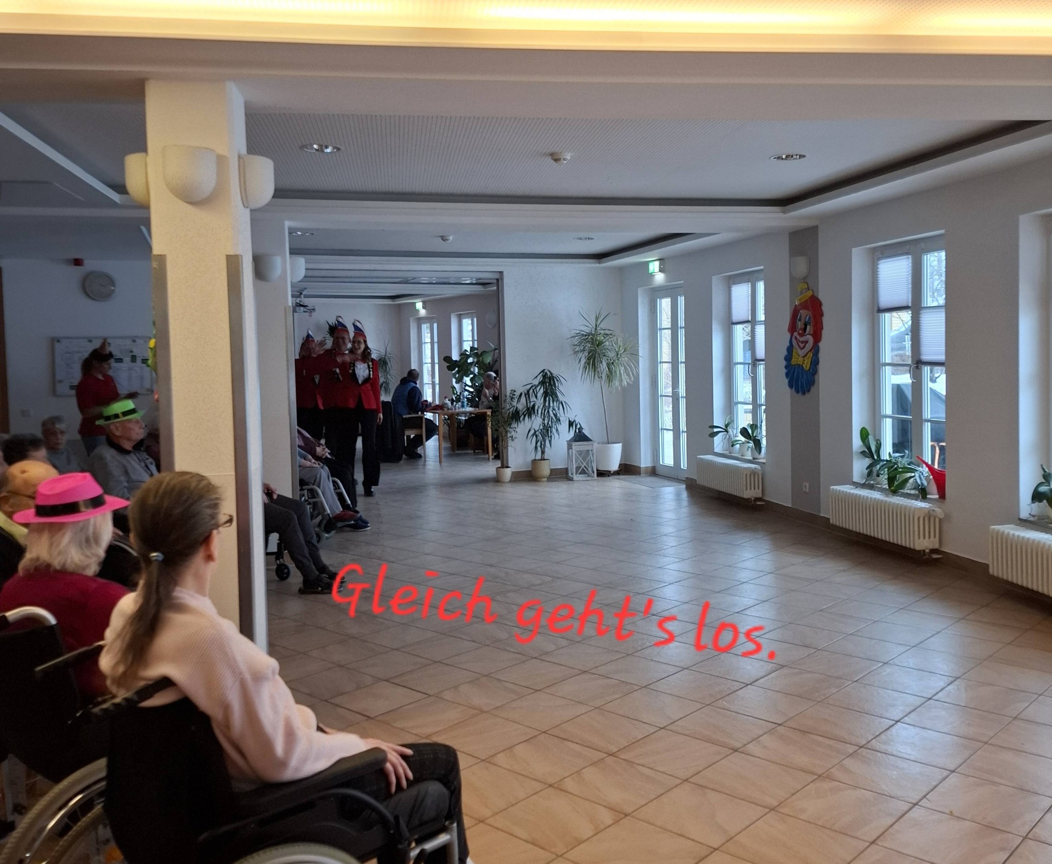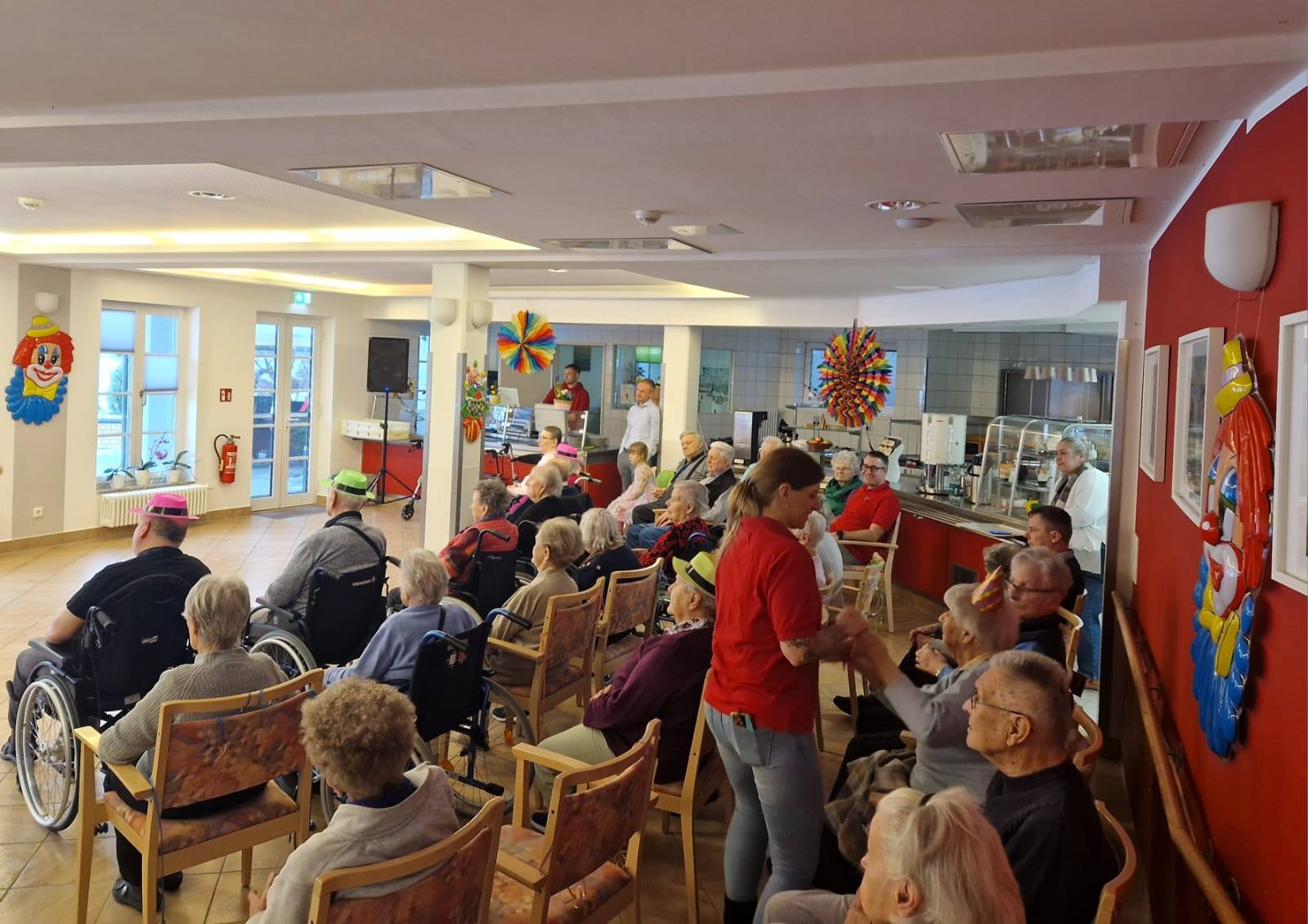 Unsere Bewohner haben Platz im Restaurant unseres Seniorenzentrums genommen. Leises Getuschel in den Reihen, den Blick nach links gerichtet, Richtung Caféteria. „Von dort werden sie gleich einmarschieren.“, so ein Bewohner, der seit vielen Jahren dieses Event in der Faschingszeit besucht. Und wirklich, wenige Sekunden später beginnt der Auftritt des Schmergower Carnevals Verein.