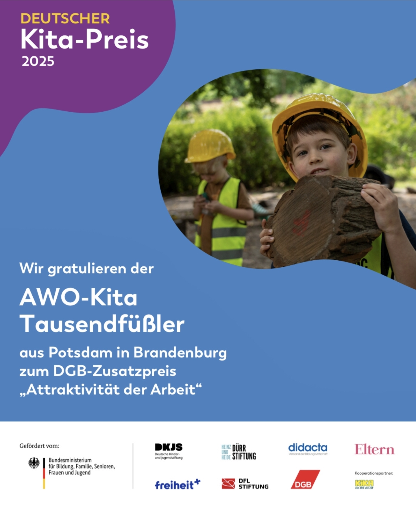 Wir freuen uns sehr, bekannt zu geben, dass unsere Kita den Sonderpreis für „Attraktivität der Arbeit“ in der Kategorie Kita des Jahres erhalten hat. Der vom Deutschen Gewerkschaftsbund (DGB) geförderte Preis ist mit 2.000 Euro dotiert und wurde vom Deutschen Kita-Preis verliehen. Er würdigt unser Engagement für ein wertschätzendes, professionelles und motivierendes Arbeitsumfeld für alle Mitarbeitenden unserer Einrichtung.