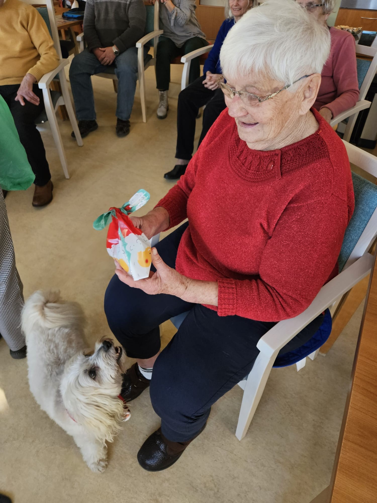 Heute besuchte uns Amy in diesem Jahr zum letzten Mal. Es war ihr und unserer ehrenamtlich engagierten Frau Herdis T. ein großes Bedürfnis, die Tagespflegebesucher auch in diesem Jahr zu Weihnachten mit einem Geschenk zu überraschen.