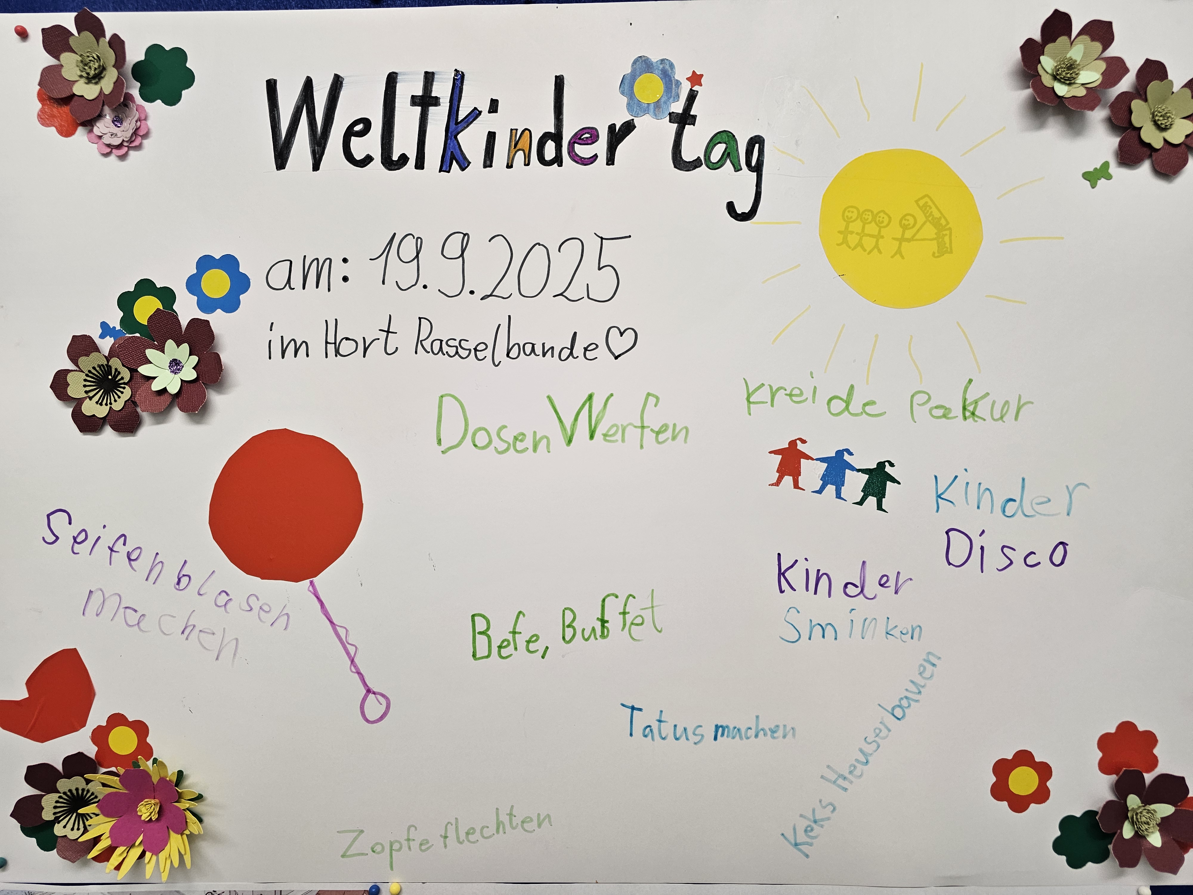 Heute haben wir im Hort Weltkindertag gefeiert. Nachdem alle Kinder aus dem Unterricht kamen, war der Hort schon bunt geschmückt. Um 14:00 Uhr trafen wir uns alle auf dem Fußballplatz zur Eröffnung und dann gemeinsam in den Hort.