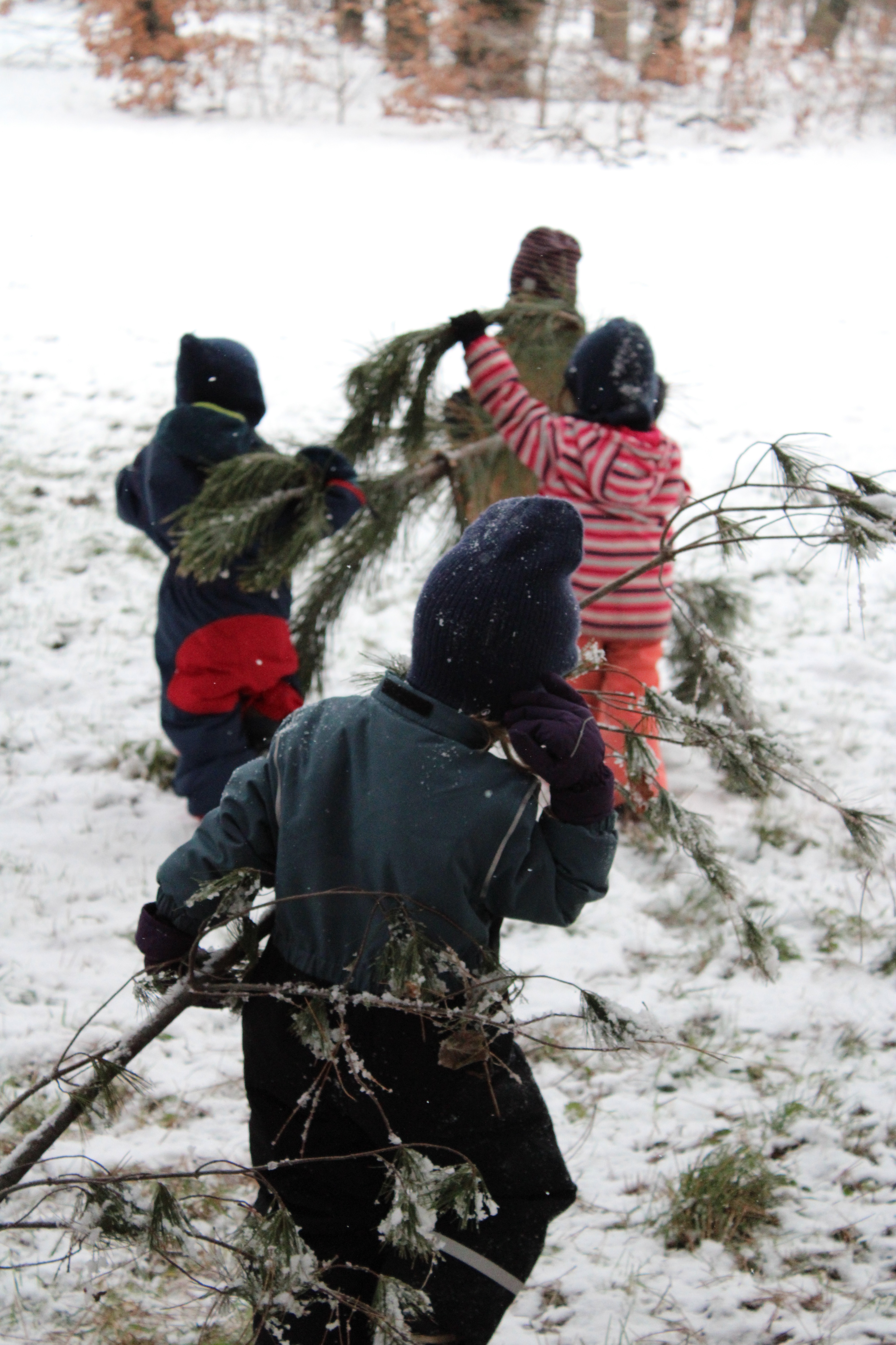 Ein weiterer Höhepunkt unseres Spaziergangs war das Entdecken einer Baumspitze einer Kiefer, die auf dem Boden lag. Wir prüften, wie schwer die Äste waren, indem wir sie anhoben. Einige waren sehr schwer, und die trugen wir dann zusammen. Die Baumspitze, dick und schwer vom Schnee, lag wie ein kleines Naturkunstwerk auf dem Boden.