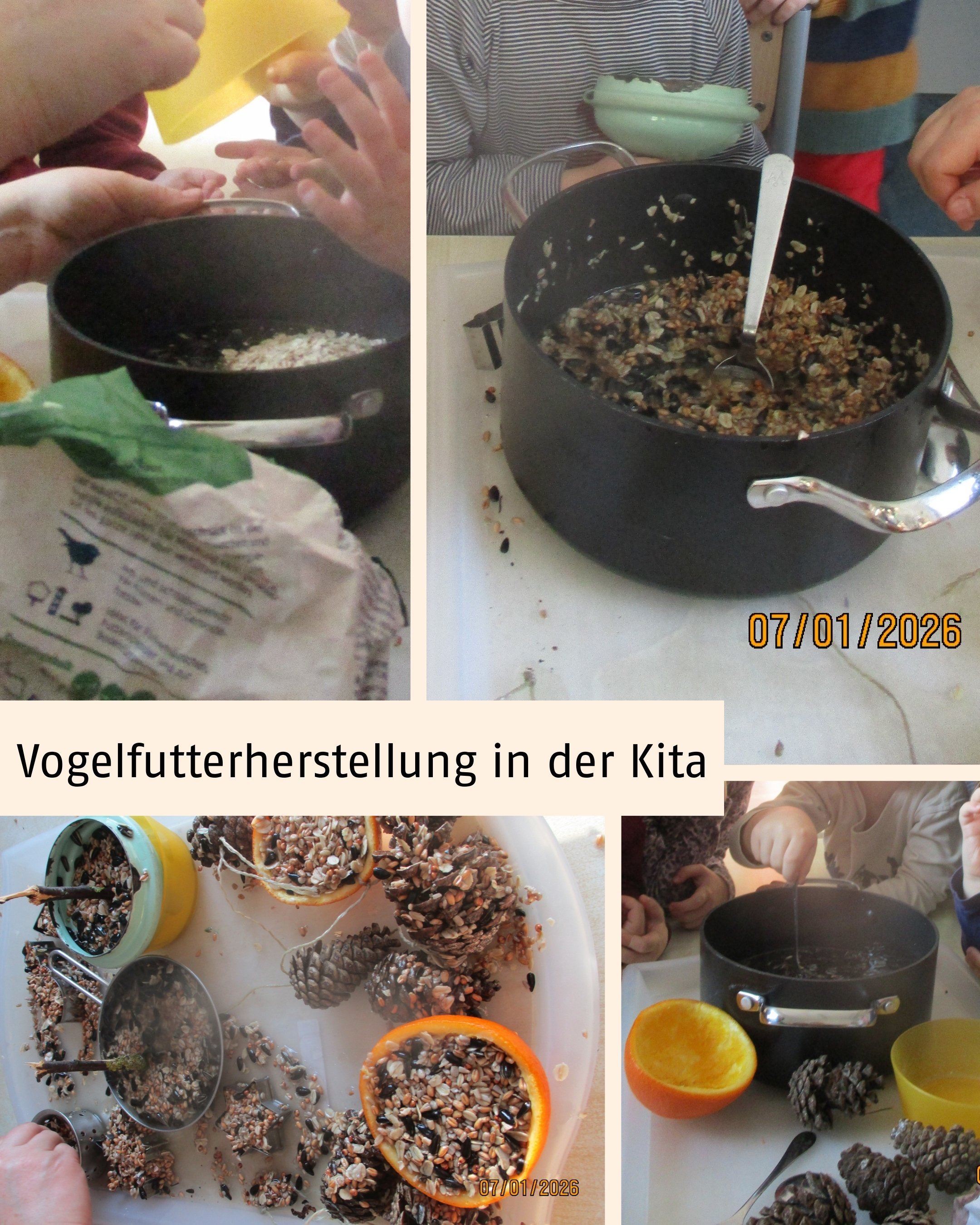 Nachdem wir die Kiefernzapfen erkundet hatten, unterhielten wir uns über die Vögel. Wir überlegten, ob sie bei diesem Wetter genug Futter finden. Es muss für sie im Moment schwer sein, also kam die Idee auf, Vogelfutter selbst herzustellen (mit Haferflocken, Sonnenblumensamen, Basismüsli und Kokosfett). Es war ein schönes, lehrreiches Erlebnis, bei dem wir spielerisch viel über die Natur und ihre Jahreszeiten lernen konnten.