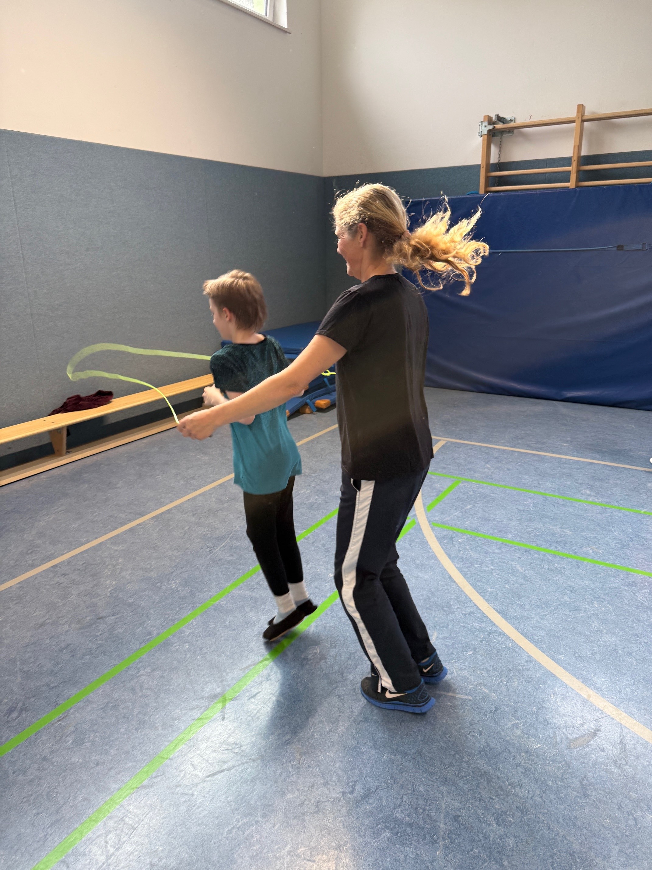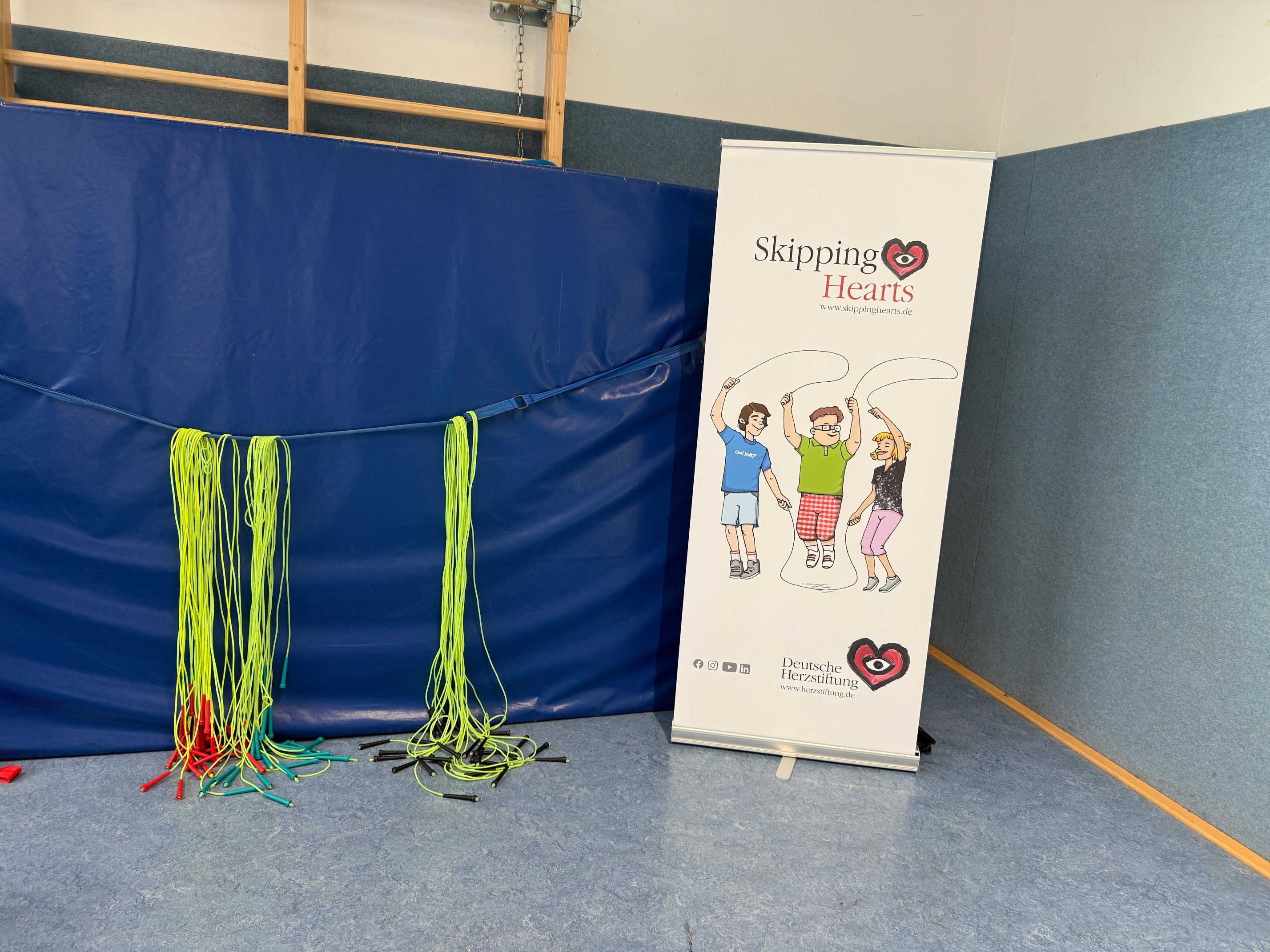Warum heißt es Skipping und nicht Jumping? Aber das war nur eine Frage, der wir noch auf den Grund gehen wollen! Am 10.3. 2026 nahmen 25 Kinder der 3./4. Jahrgangsstufe am Workshop Skipping Hearts der Deutschen Herzstiftung e.V. teil. Juliane Neumann - eine Expertin in Theorie und Praxis zeigte den Kindern, wie sie Basic Jumps um einfache Varianten erweitern oder mit herausfordernden Sprüngen kombinieren können, wie leicht man zusammen mit einem Partner springen kann und wie innerhalb kürzester Zeit eine gemeinsame Präsentation choreografiert werden kann. Die geladenen Gäste und Kinder der Schule waren begeistert und wurden eingeladen, es auch zu probieren. Dieser Workshop war der Auftakt für ein kontinuierliches Springseil-Training, das im Sportunterricht integriert wird, aber auch zu Hause geübt werden kann. Demnächst wird der Schule ein kostenloses Materialpaket zur Verfügung gestellt, damit noch mehr Kinder mit ihrem persönlichen Trainingsheft üben können, um zum Champion oder sogar Hero zu werden!
