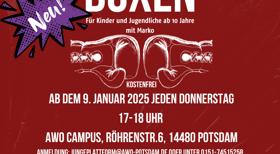 02.12.2024 12:04 UhrMehr Platz, mehr Möglichkeiten! Unser kostenfreies Boxprojekt für Kinder und Jugendliche (ab 10 Jahre) zieht aus Waldstadt an den Stern. Ab dem 09.01. findet das kostenfreie ...