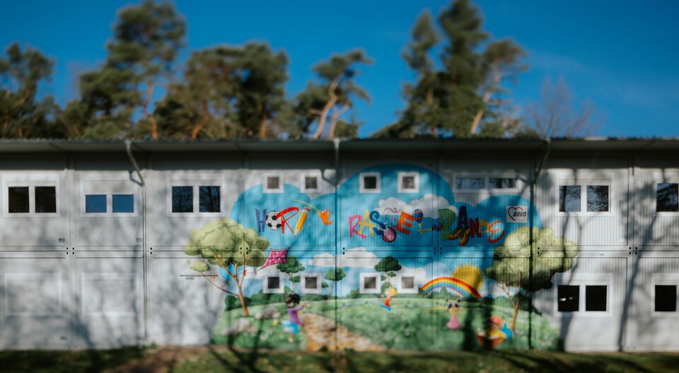 Unsere Außenfassade wurde zusammen mit den Kindern in Rahmen eines Projektes und professionellen Sprayern gestaltet.