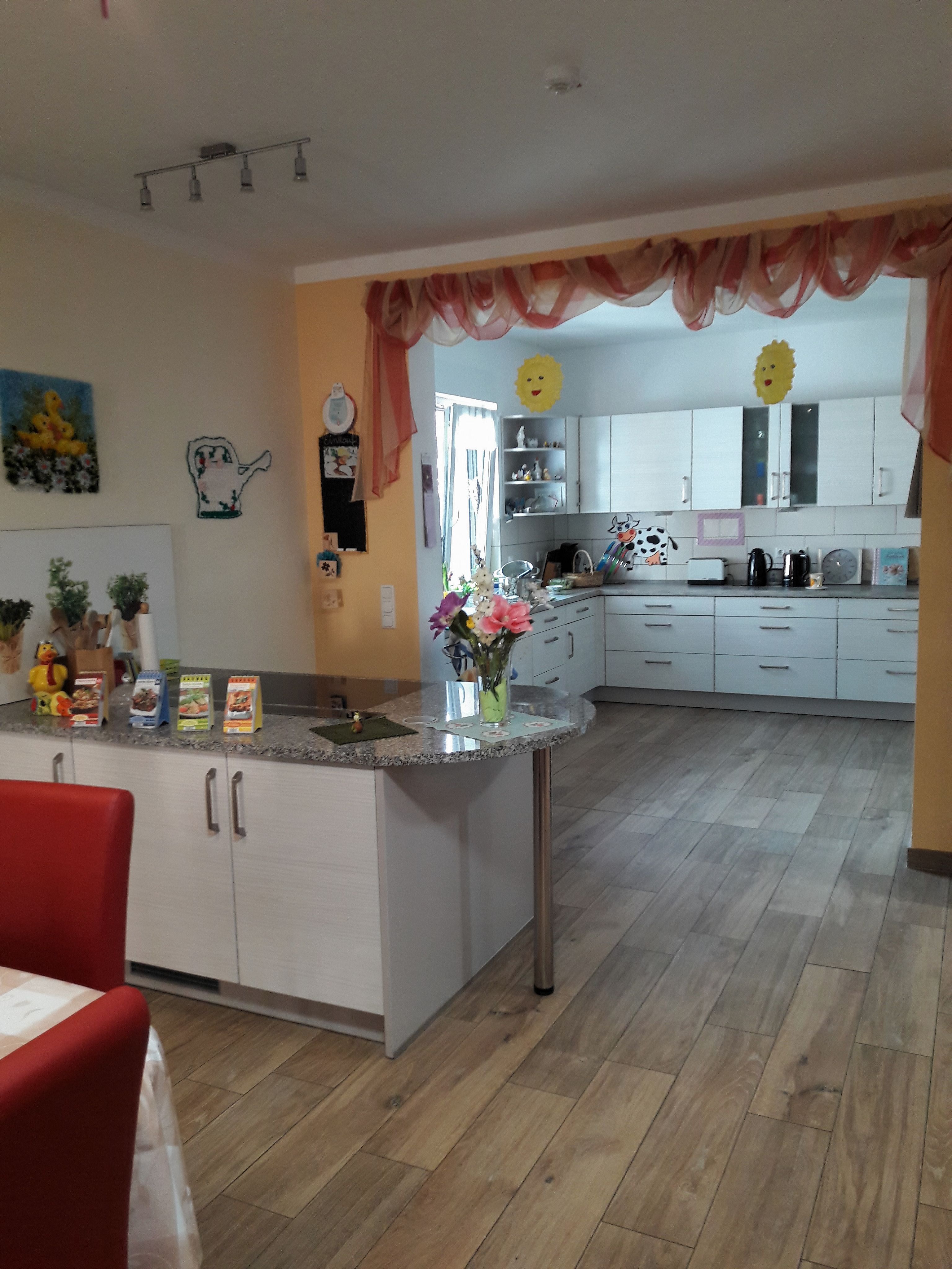 Es gibt einen Gemeinschaftsraum mit offener Küche, 5 Bäder und ein Pflegebad. Wir unterstützen bei Bedarf bei der persönlichen Körperpflege.